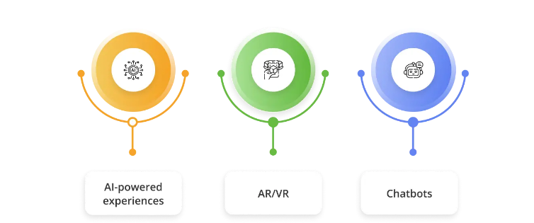 You can implement AI-powered experiences in ways that cover personalization, content creation, advanced analytics, and others. Some businesses refer to AR/VR, which can be accessed by many users of virtual reality across Apple Vision (as an example), playing 3D games, and more.